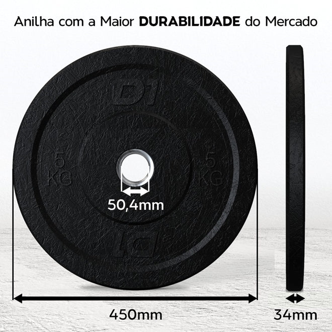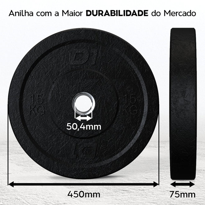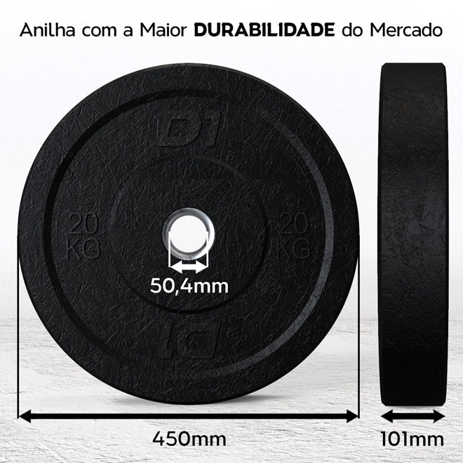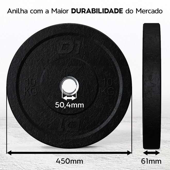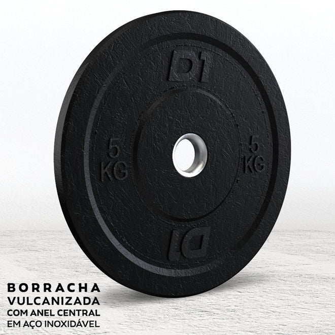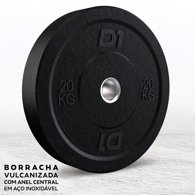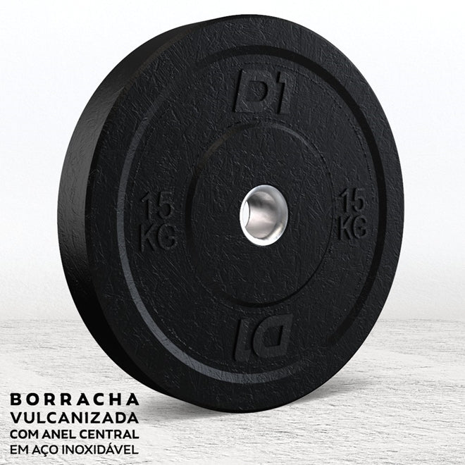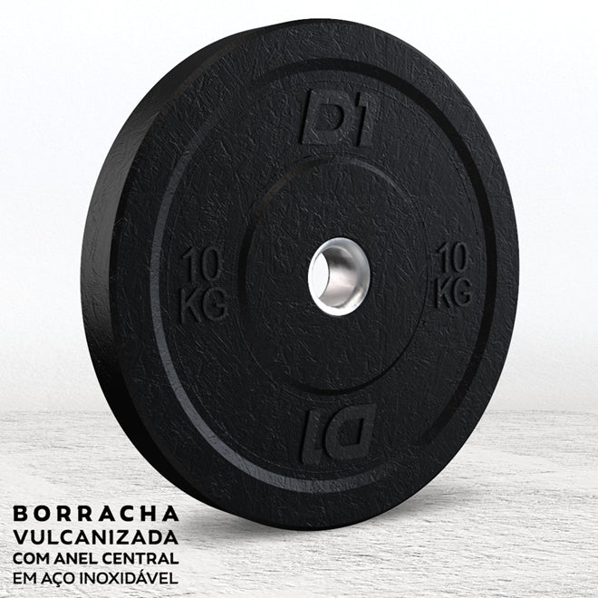 As Anilhas Olimpicas Bumper Hi Temp D1 são construídas a partir de um casamento quase indestrutível de borracha vulcanizada com anel central em aço inoxidável. Este modelo de é também conhecido como Anilha Crumb.