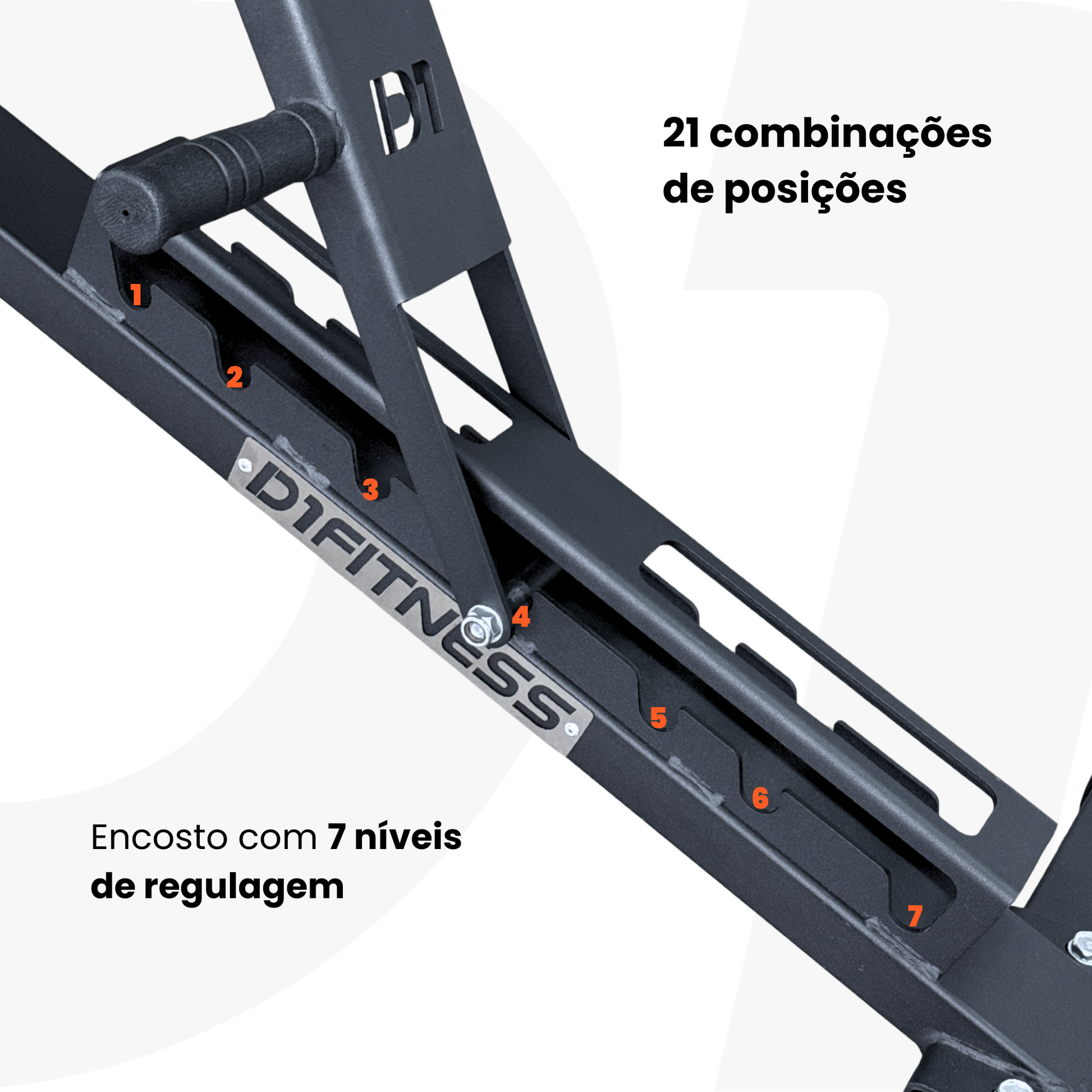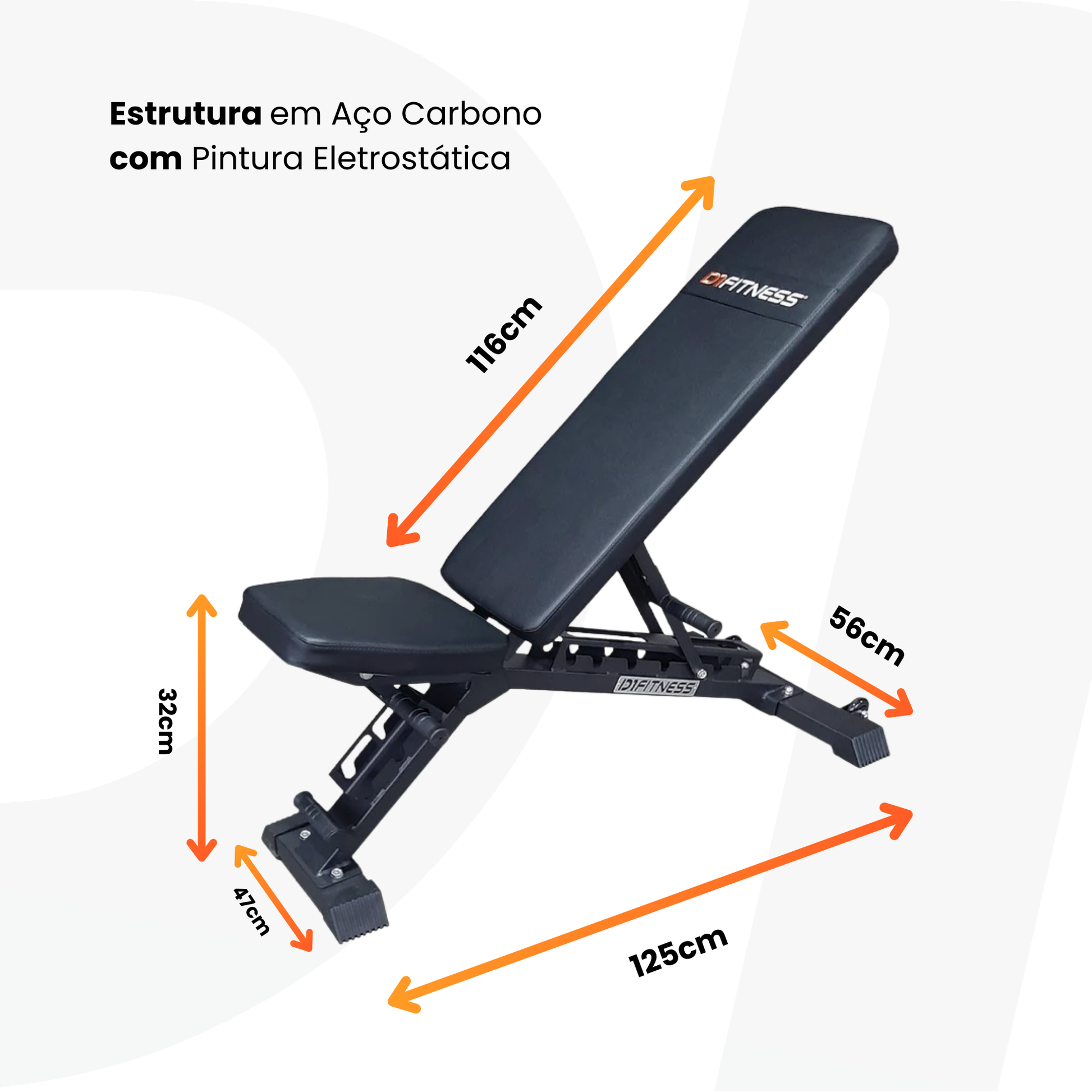 Seu design moderno e funcional conta com 7 níveis de regulagem, permitindo ajustes precisos do encosto e do assento, adaptando-se a exercícios retos, inclinados ou declinados. O assento, com 152 cm de comprimento na posição horizontal e altura de 47 cm, suporta com segurança até 300 kg, atendendo tanto a atletas iniciantes quanto avançados.