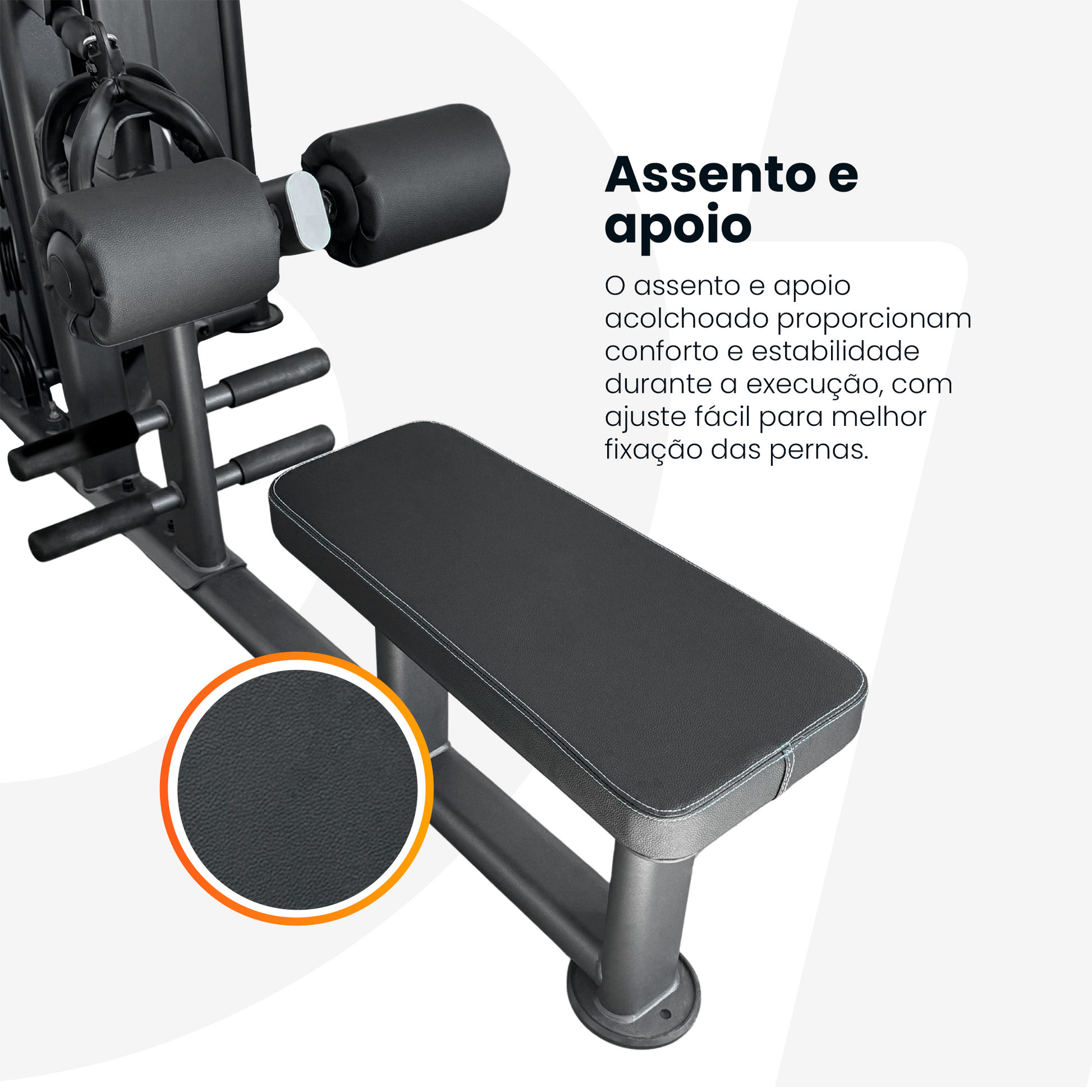 - Ajustes Ergonômicos: Banco e plataforma ajustáveis para variação de ângulos e foco muscular.